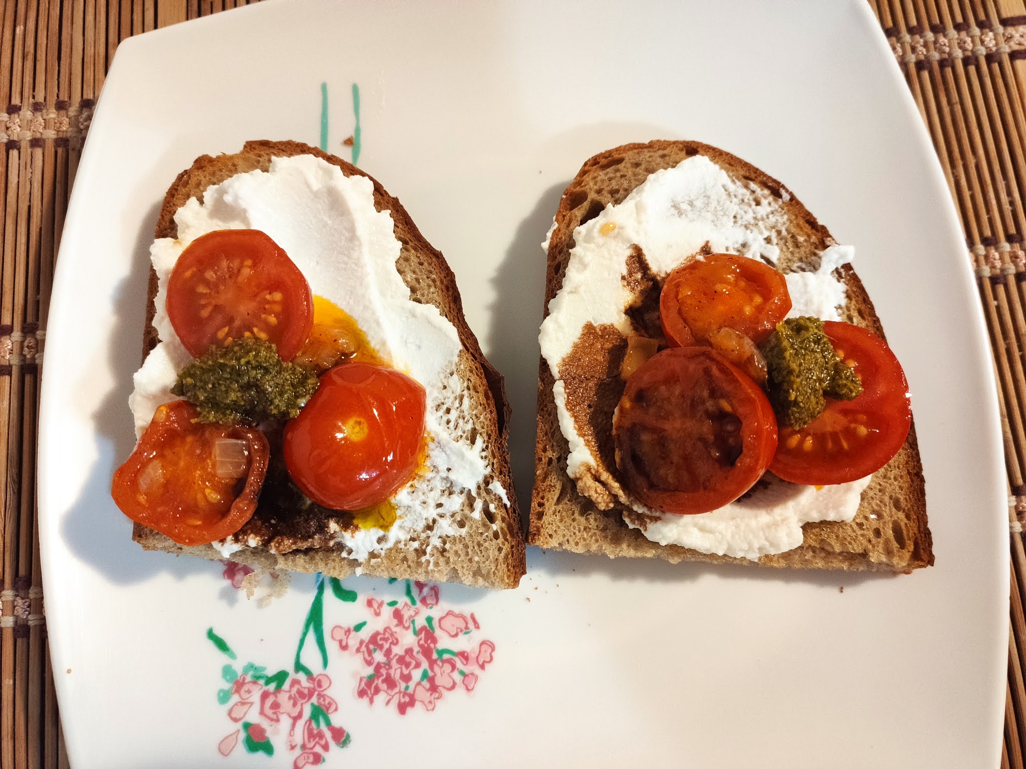 K večeři je možné připravit i následující mňamka. Na plech s pečícím papírem vyskládáme plátky chleba, potřeme olejem, dáme potřenou stranou dospod a necháme krátce v troubě, předehřáté na 200°C. Pak chleby otočíme. A ještě chvilku v troubě necháme. Pak potřeme ricottou. V pánvičce si osmahneme cibulku a na půlky nakrájená cherry rajčata. Dáme na chleby. Zakapeme balzamikovým olejem a ozdobíme pestem. To byla dobrota!